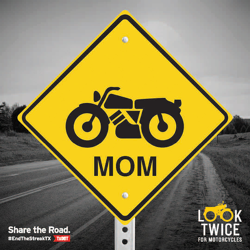 TxDOT’s Share the Road: Look Twice for Motorcycles campaign is a key component of #EndTheStreakTX, a broader social media and word-of-mouth effort that encourages drivers to make safer choices while behind the wheel to help end the streak of daily deaths. Nov. 7, 2000, was the last deathless day on Texas roadways.