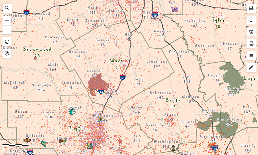 “Using that data, we were able to map wildflower sightings across Texas dating back more than a decade,” said Tom Neville, a TxDOT GIS analyst, who helped develop the new layer. “The dataset was eventually refined, and a heat map was created to show concentrations of wildflower activity across the state.”