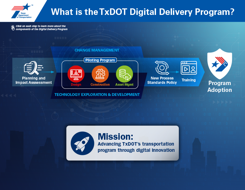 Este sitio proporciona información y recursos para apoyar la misión de TxDOT de avanzar en la forma en que TxDOT planifica, diseña y entrega proyectos de transporte, utilizando métodos y herramientas de entrega digital innovadores para permitir la toma de decisiones basada en datos, lograr eficiencias en todo el ciclo de vida del proyecto, apoyar la gestión de activos y proporcionar un sistema de transporte seguro y resistente para todos los tejanos.