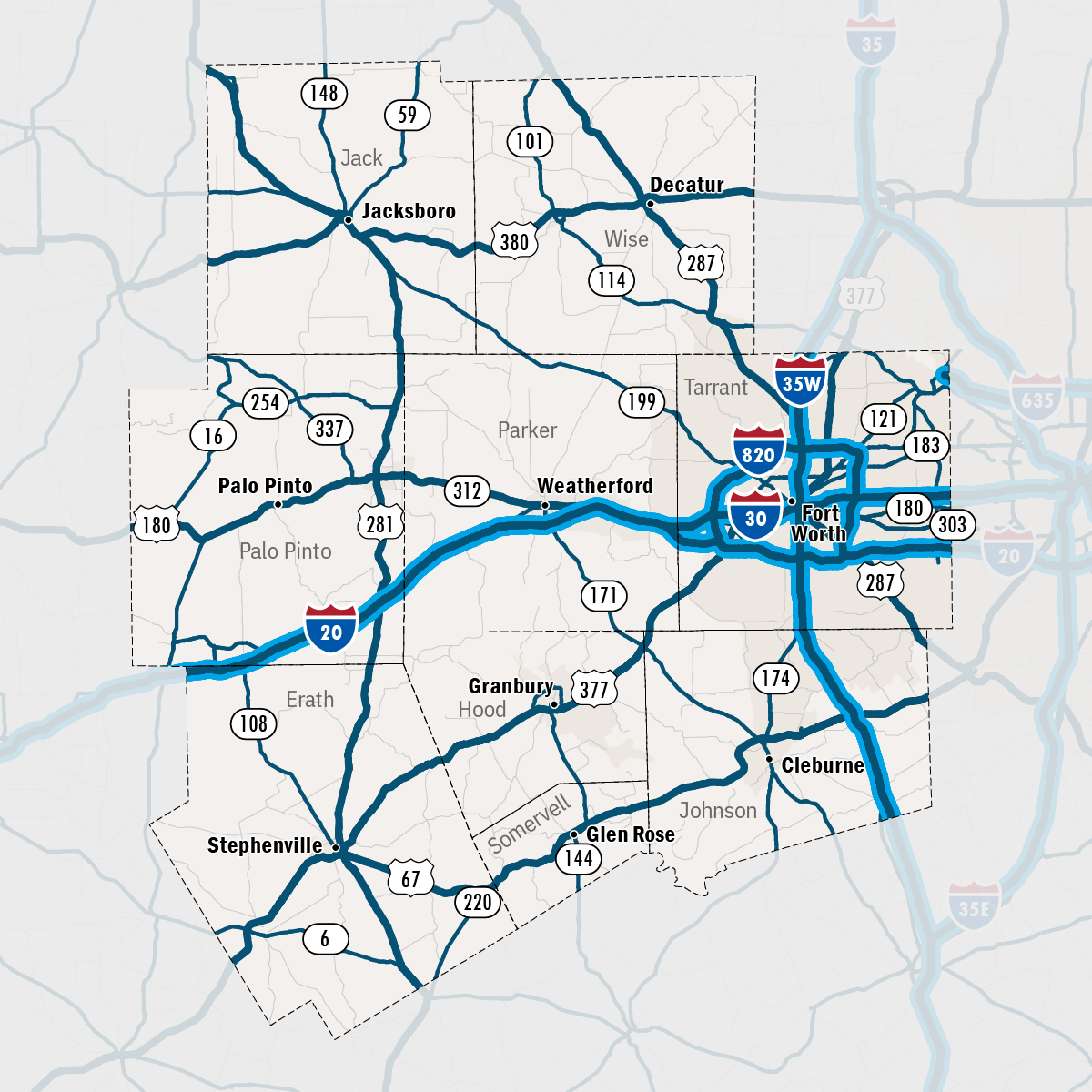 The counties in the Fort Worth District represent over 2.8 million people (9.2% of our state's population), with 2.4 million registered vehicles. In 2023, the District's daily vehicle miles traveled (DVMT) on TxDOT on-system roadways was 52.6 million miles (6.4% of statewide on-system DVMT).