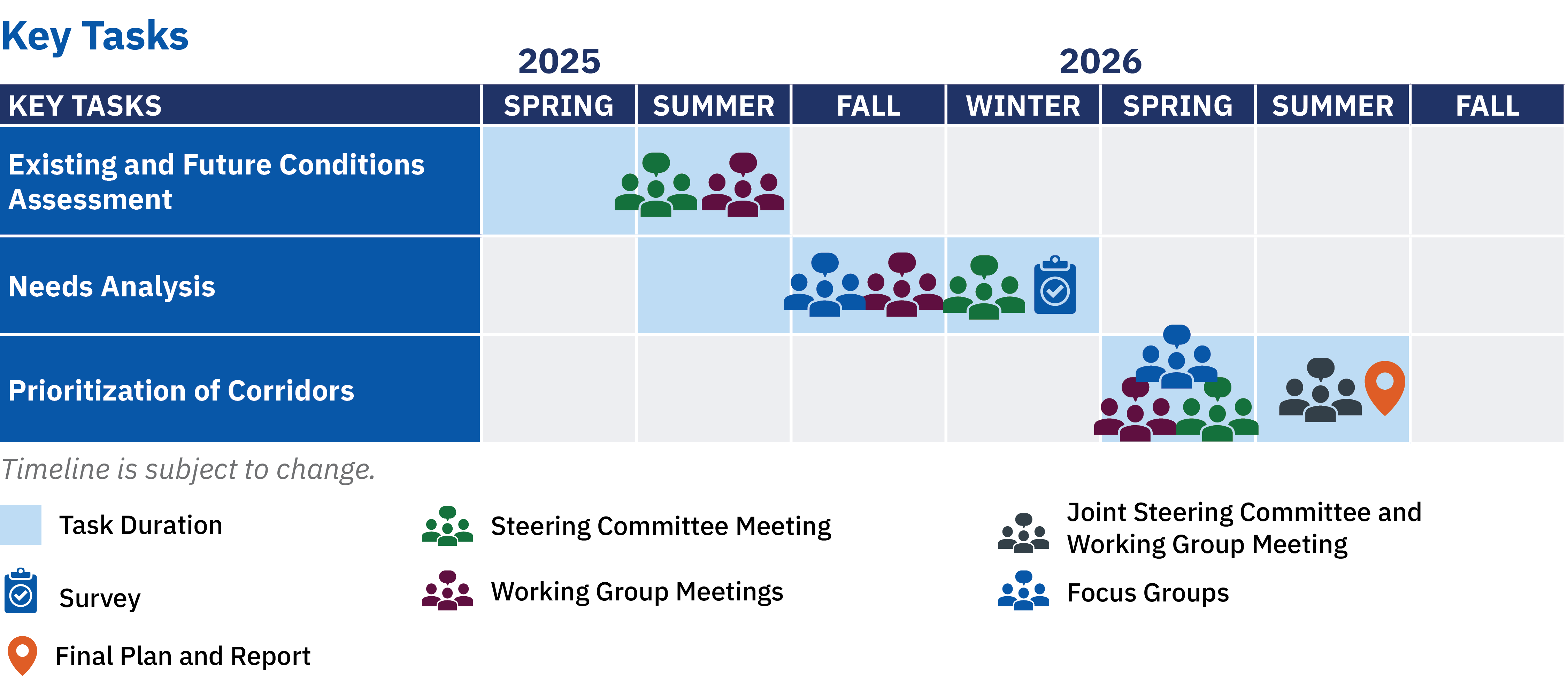 Additionally, stakeholder and public input will be gathered through in-person and virtual public meetings, focus groups, stakeholder interviews, and a public survey. The Steering Committee and Working Group members will include:
