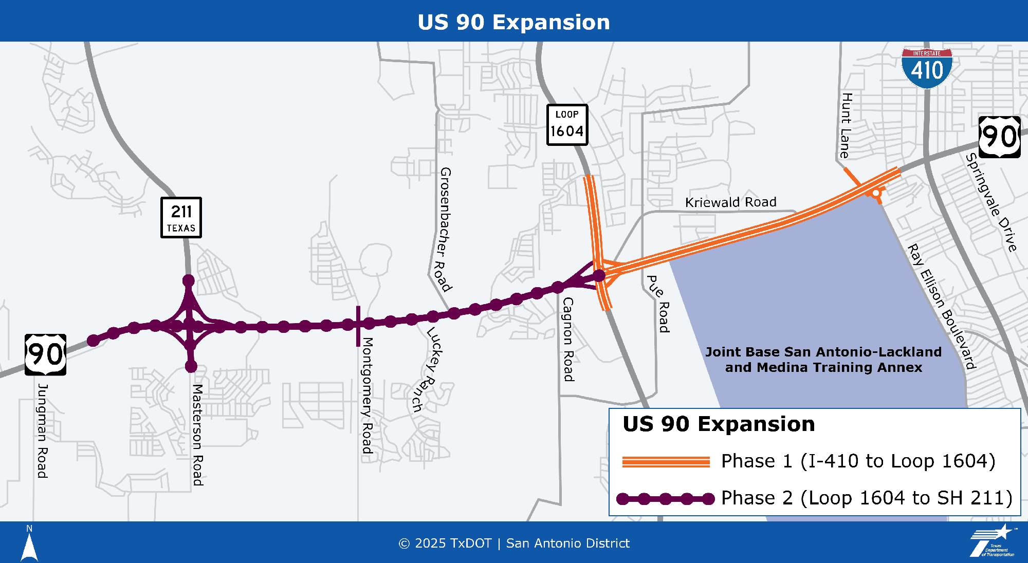- Constructing a two-lane flyover ramp connecting westbound US 90 to northbound Loop 1604.
